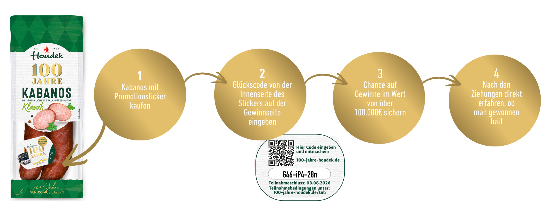 Kaufe Dir eine Packung Houdek Kabanos 150 g mit Aktionssticker. Gib' den Glückscode auf der Gewinnseite ein und sichere Dir die Chance auf Gewinne im Wert von über 100.000 €.